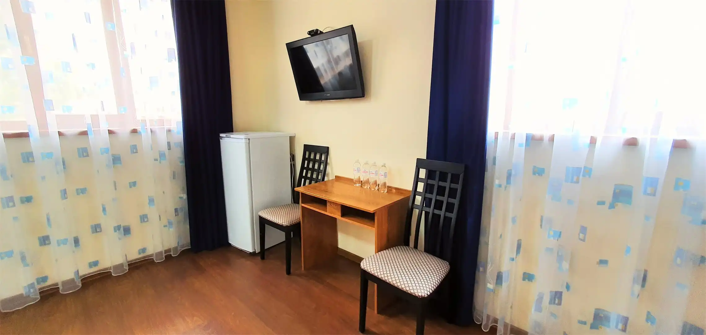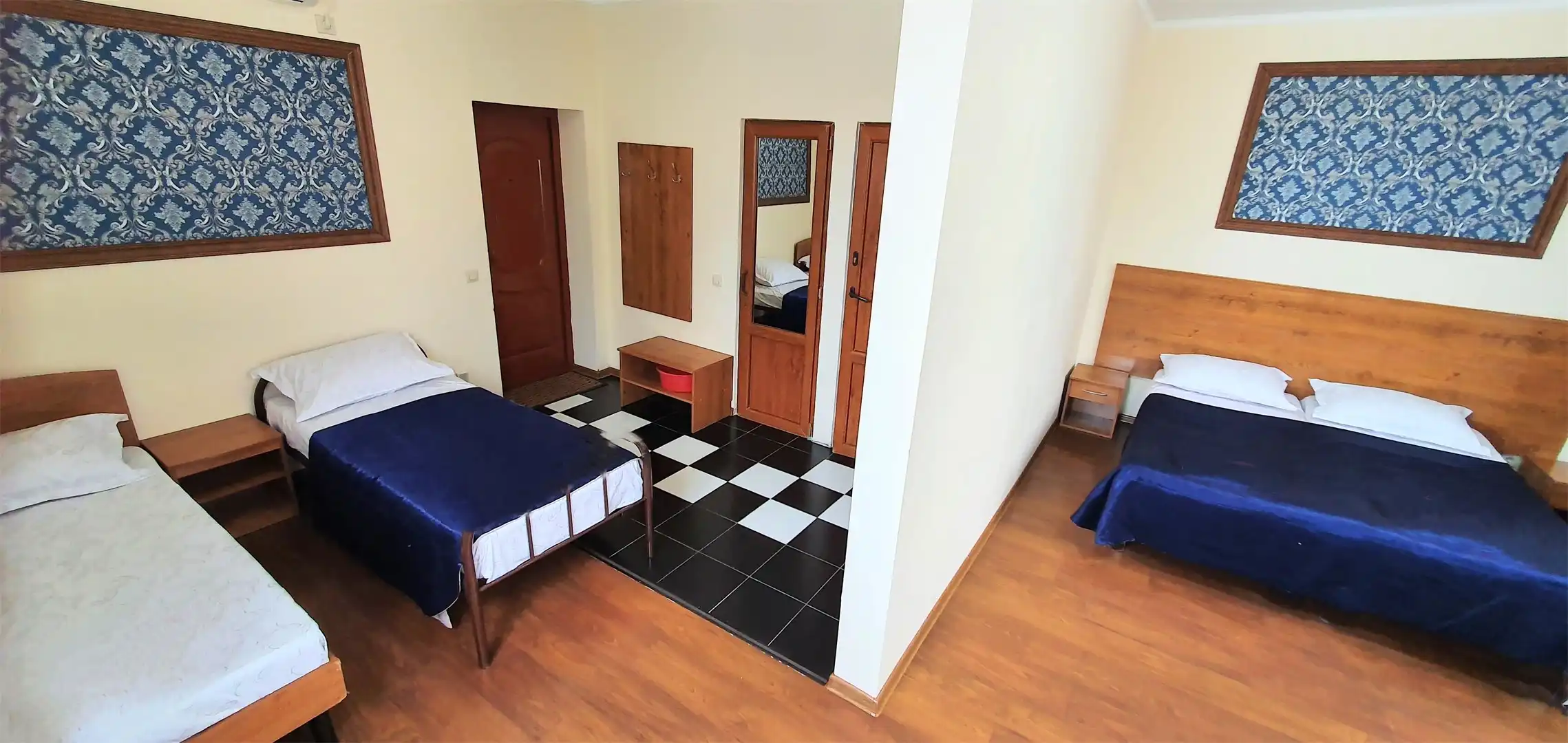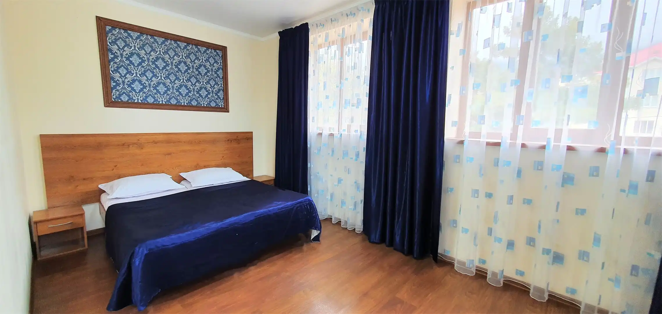— 2-3-4-х местный номер со всеми удобствами: просторные номера, в номере сплит-система (кондиционер), телевизор, холодильник, чайник, индивидуальный санузел с ванной, в некоторых имеется балкон. В номер двуспальная кровать (можно раздвинуть) или раскладной диван, односпальная кровать. У всех номеров предусмотрена своя зона для отдыха перед входом.